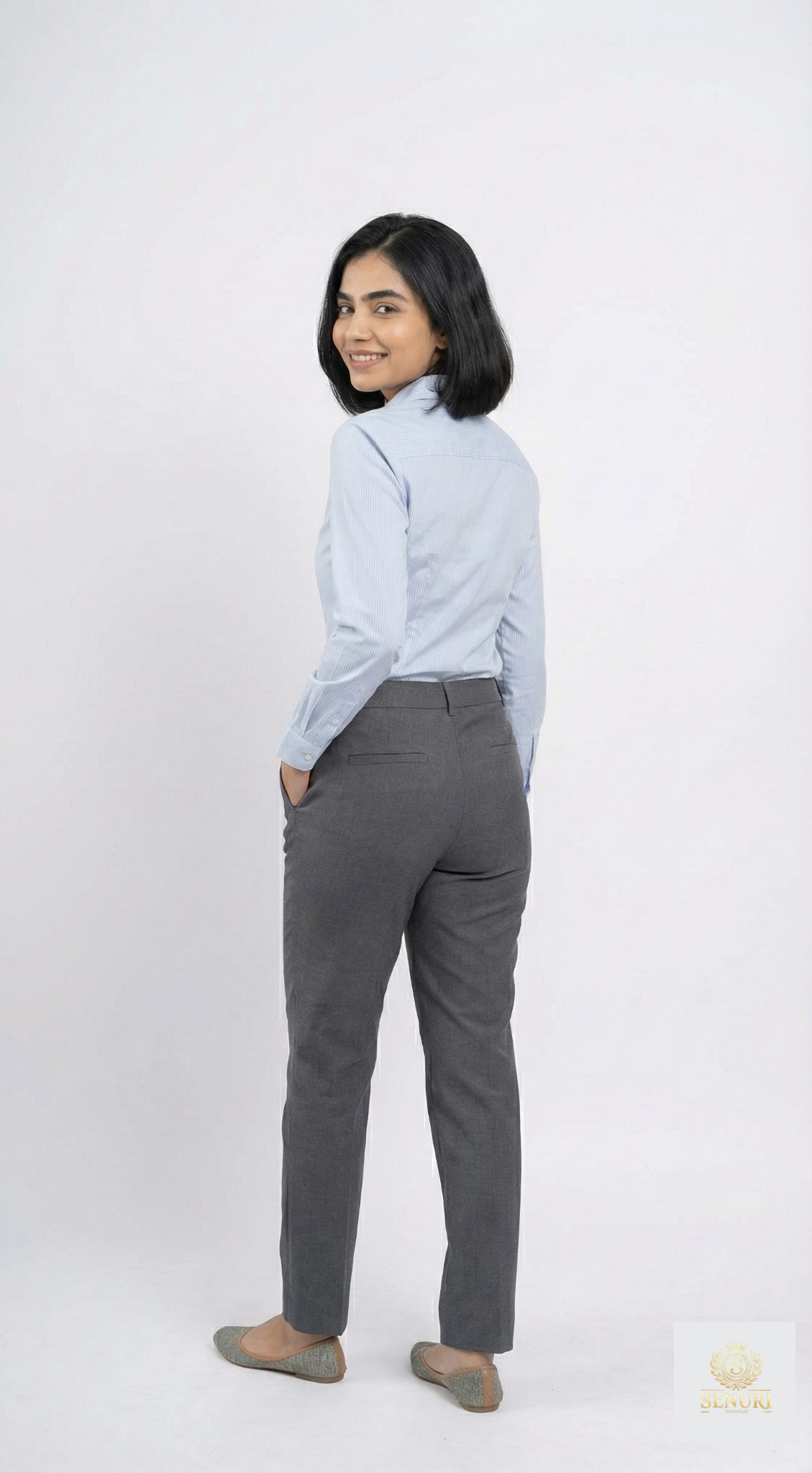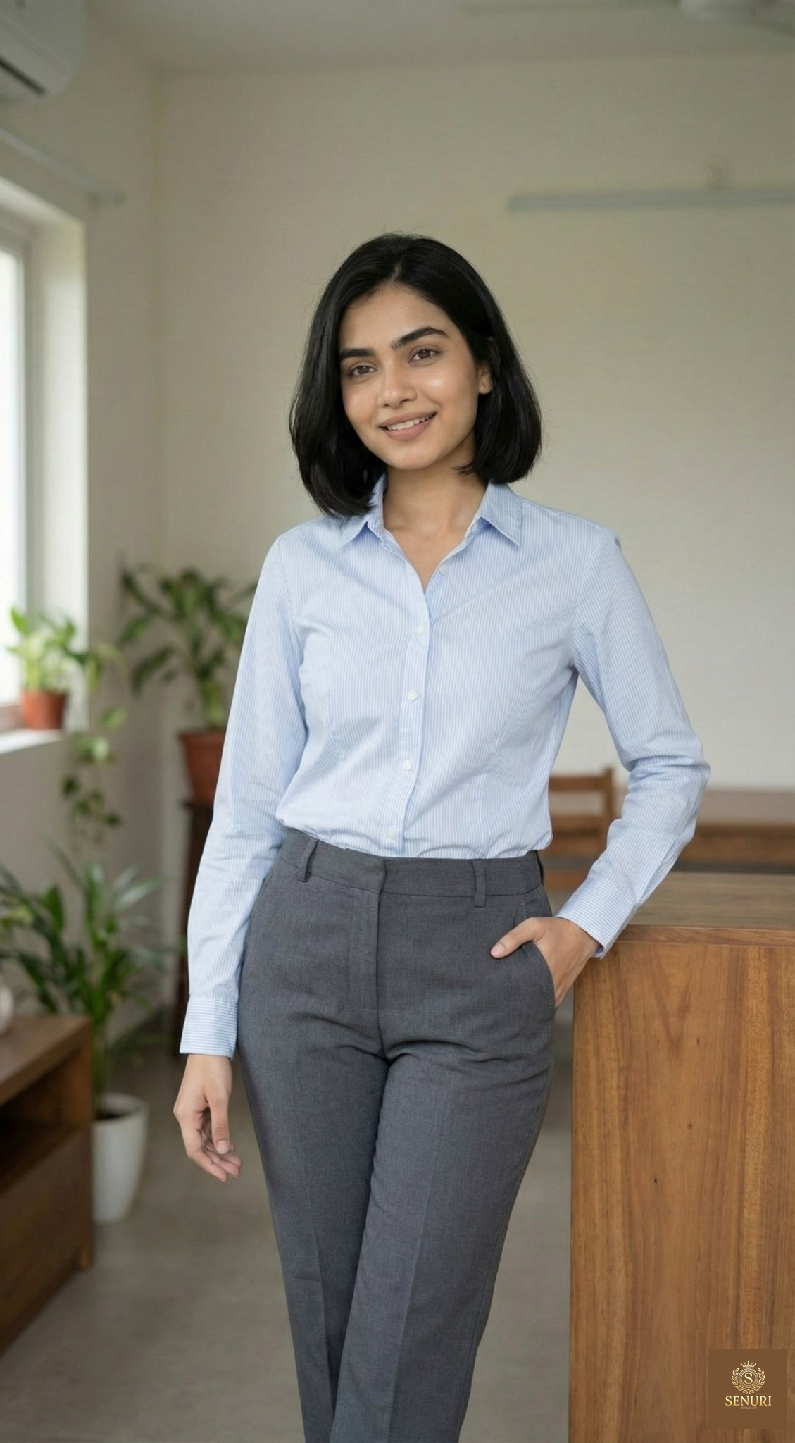 Light blue striped button-down with tailored grey pants; crisp everyday officewear.