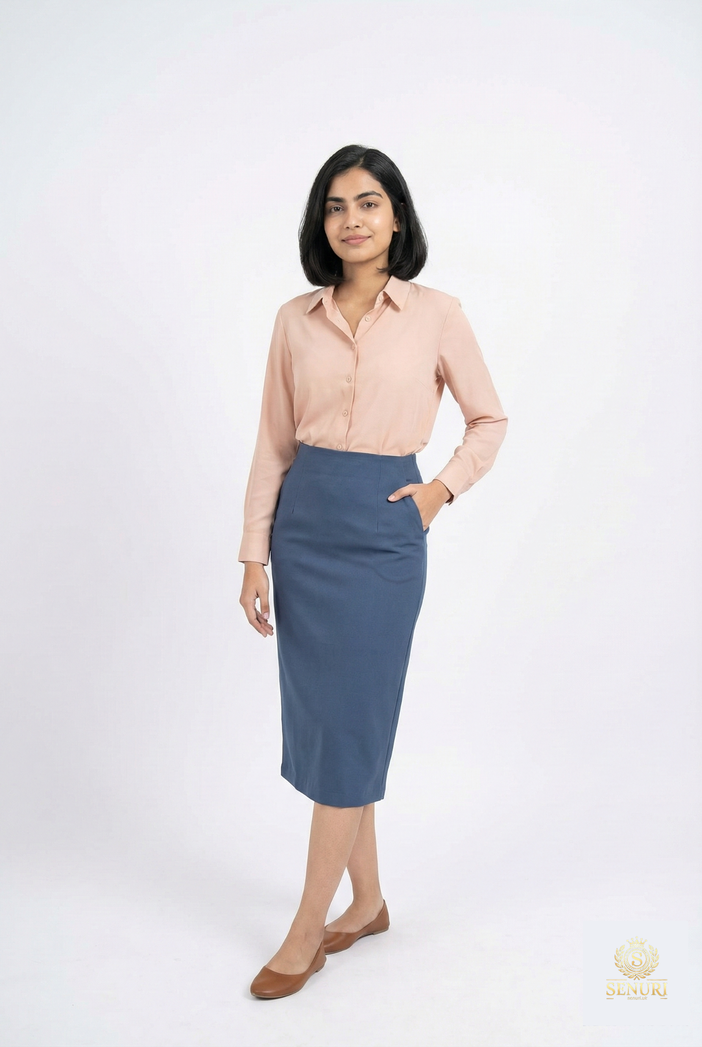 A soft blush long-sleeve button-up shirt with a simple collar and clean front placket, tucked neatly into a high-waisted blue pencil skirt that skims the hips and falls to mid-calf for a polished, office-ready silhouette.