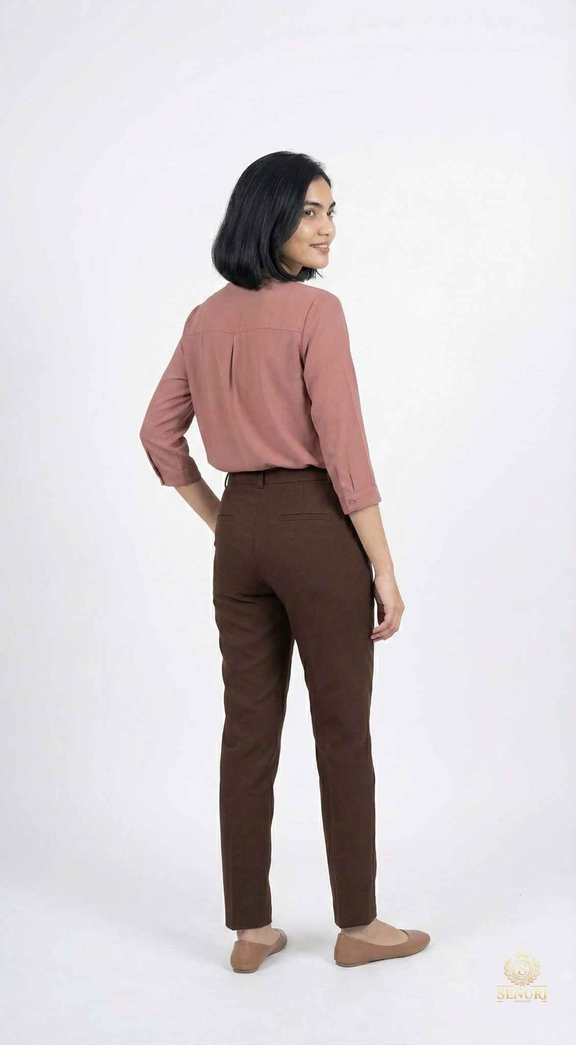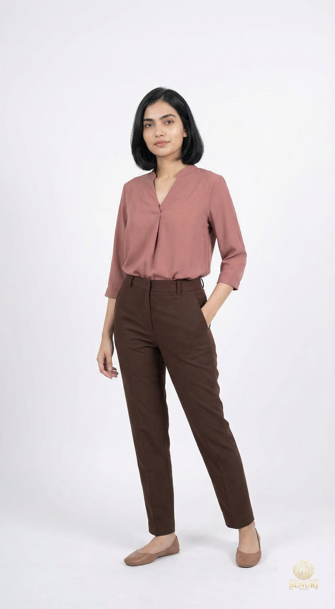 Soft mauve V-neck blouse with tailored brown pants; warm, earthy office palette.